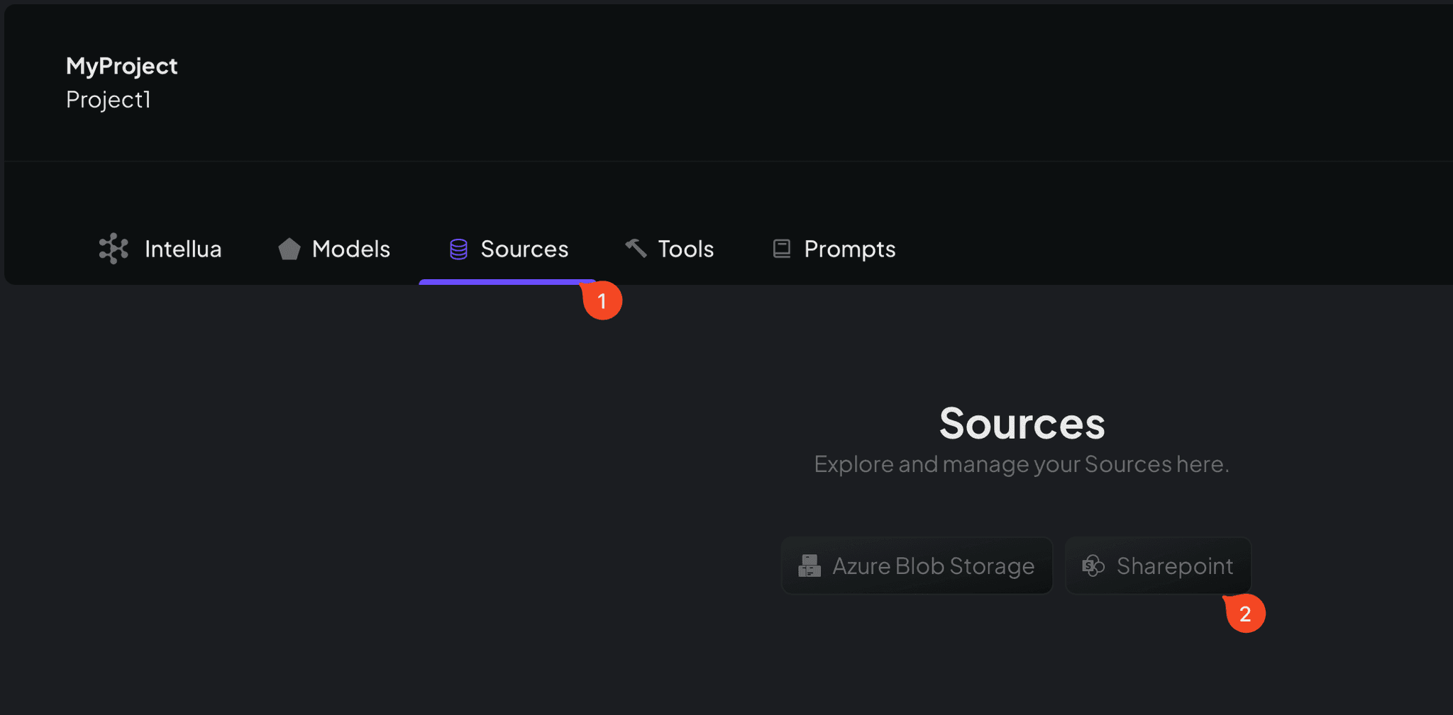 Go back to your project and click sources and then press Sharepoint. Continue by filling in the form and authenticating Sharepoint.