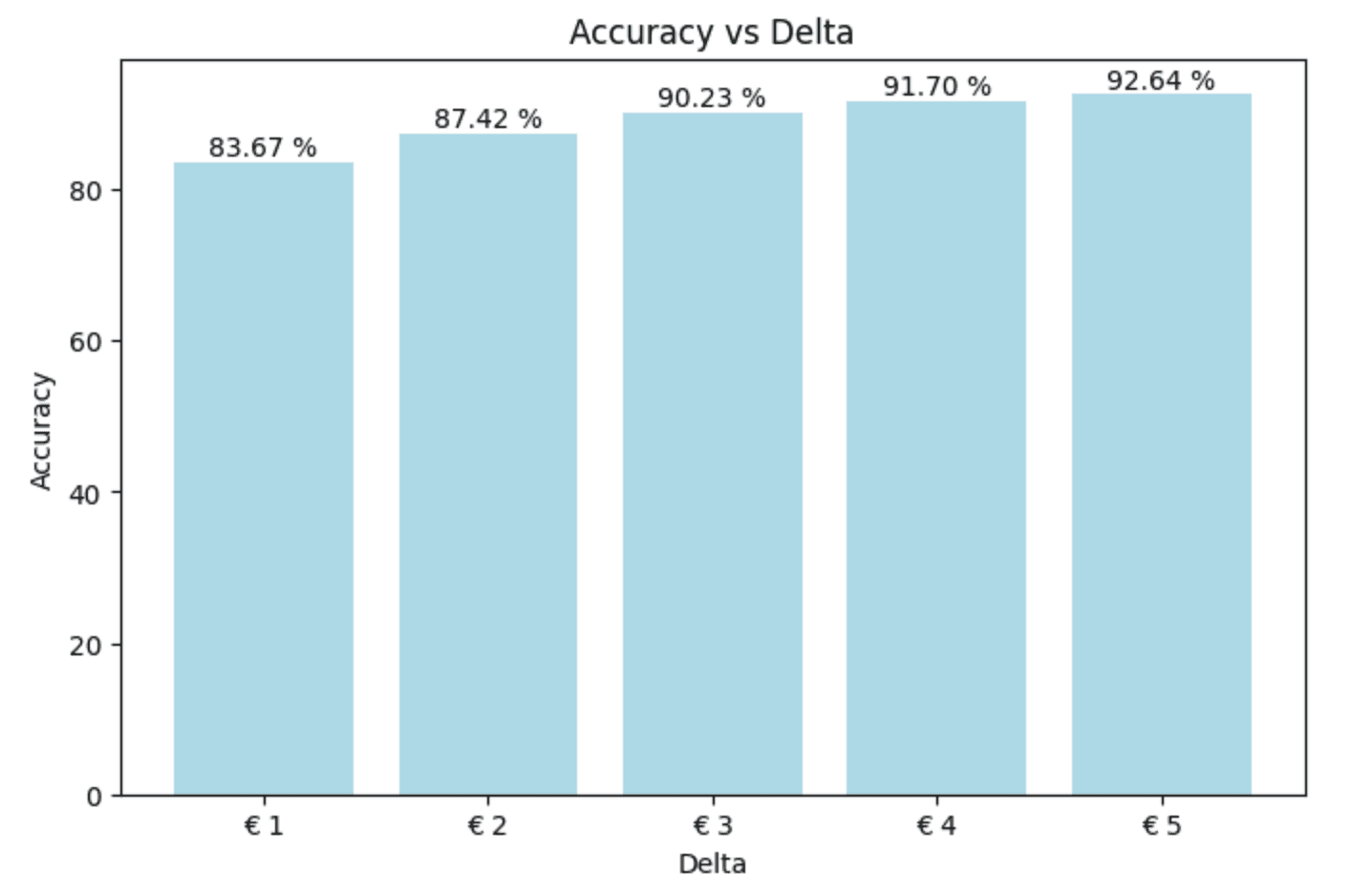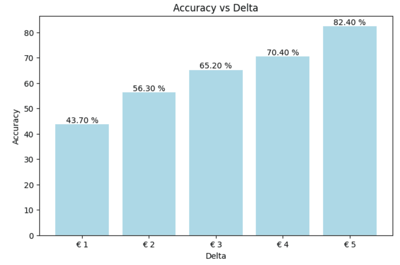 Not very good. This graph means that we only have an accuracy of 43,70 % with a delta of 1 euro. That means we're not very close to the actual results.