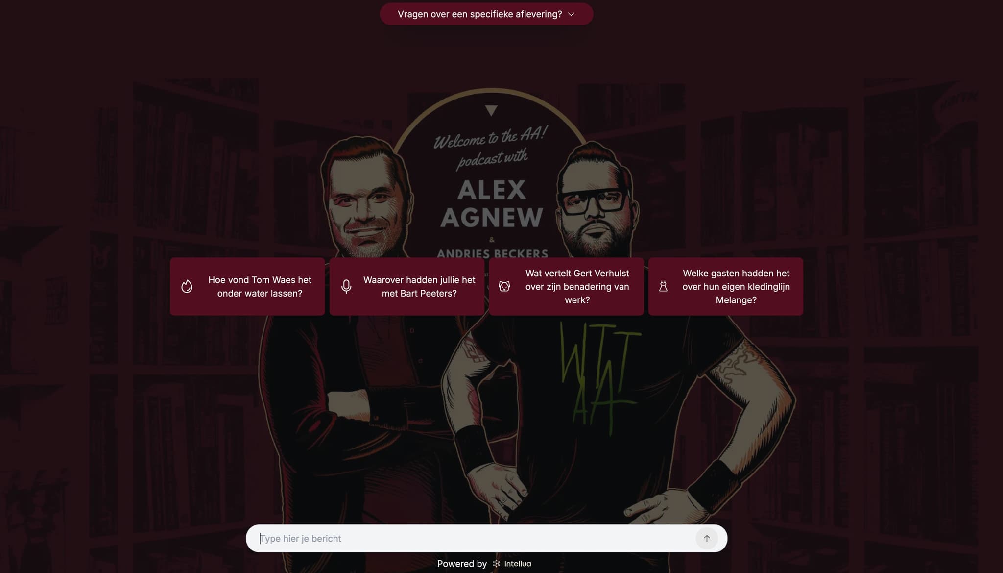 We’re always looking for innovative ways to connect audiences with rich, valuable content. That’s why we’re excited to introduce our new chatbot for the popular podcast "Welcome to the AA" hosted by Alex Agnew and Andries Beckers. This unique tool allows fans and newcomers alike to dive into the entire archive of conversations and humor at the heart of the show.