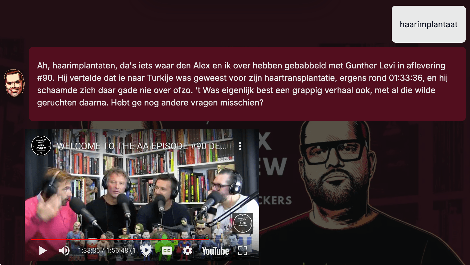 In addition to asking questions, you can also search for specific keywords—such as “haarimplantaat”—across all episodes. This feature instantly surfaces any mentions of your chosen term, making it simple to locate and revisit particular topics or discussions that pique your interest. It’s another layer of convenience, ensuring you never miss a moment of the content that matters most to you.